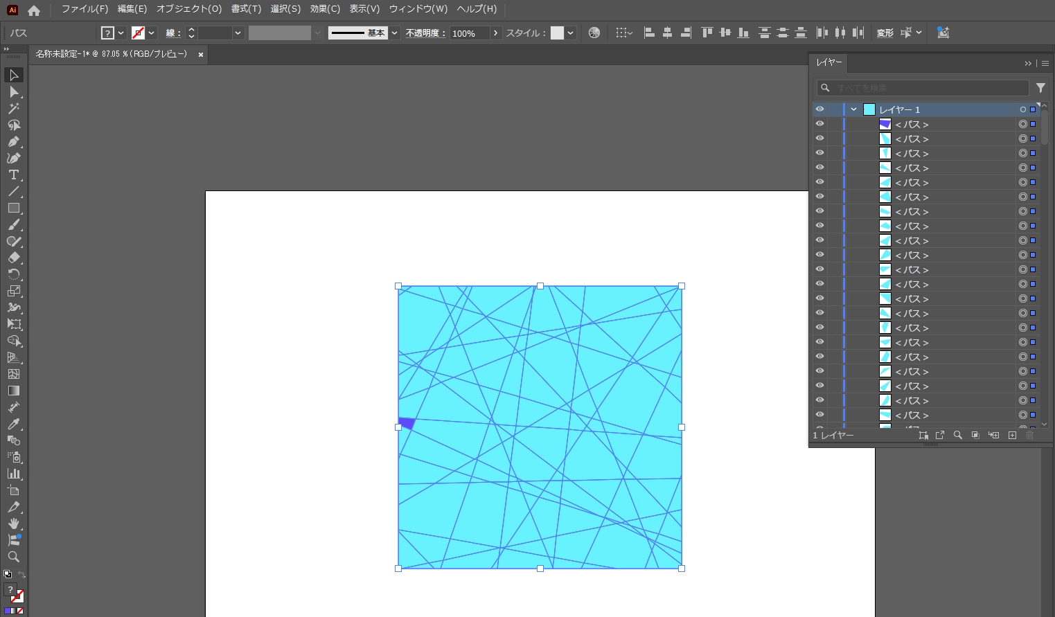 正方形の位置を決めたら線と正方形をすべて選択し、パスファインダー → 分割を選択します。分割をすることにより線で区切られ、独立したオブジェクトとして分割されます。