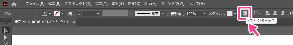 このままでは色の配置に偏りがあるため、修正していきます。選択ツールでオブジェクトをすべて選択した状態で下添付画像のアイコンをクリックし、「オブジェクトの再配色」の詳細パネルを開きます。
