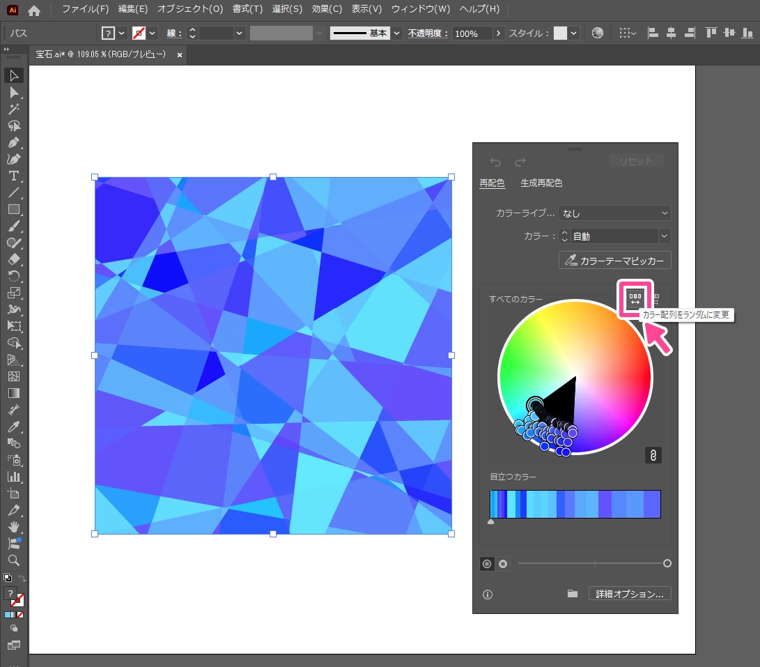 丸いカラーパレットの右上にある「カラー配置をランダムに変更」のアイコンを何度かクリックし、好みの配色になるまで調整します。