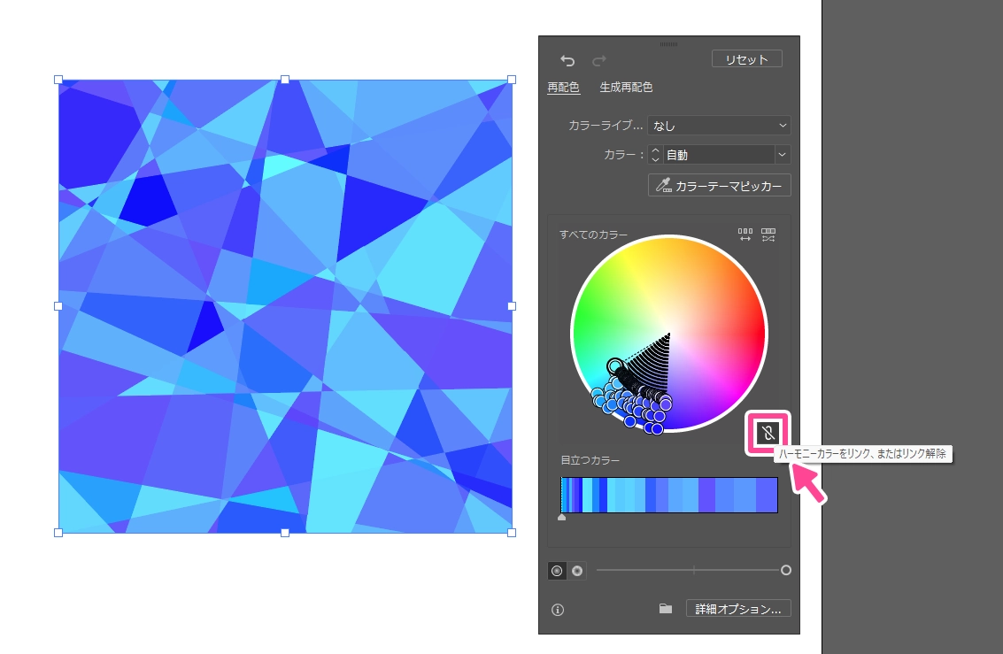 個別に色を変えたい場合は、カラーパレットの右下にある鎖アイコンを押してカラーハーモニーを解除すれば、それぞれを独立して動かせるようになります。