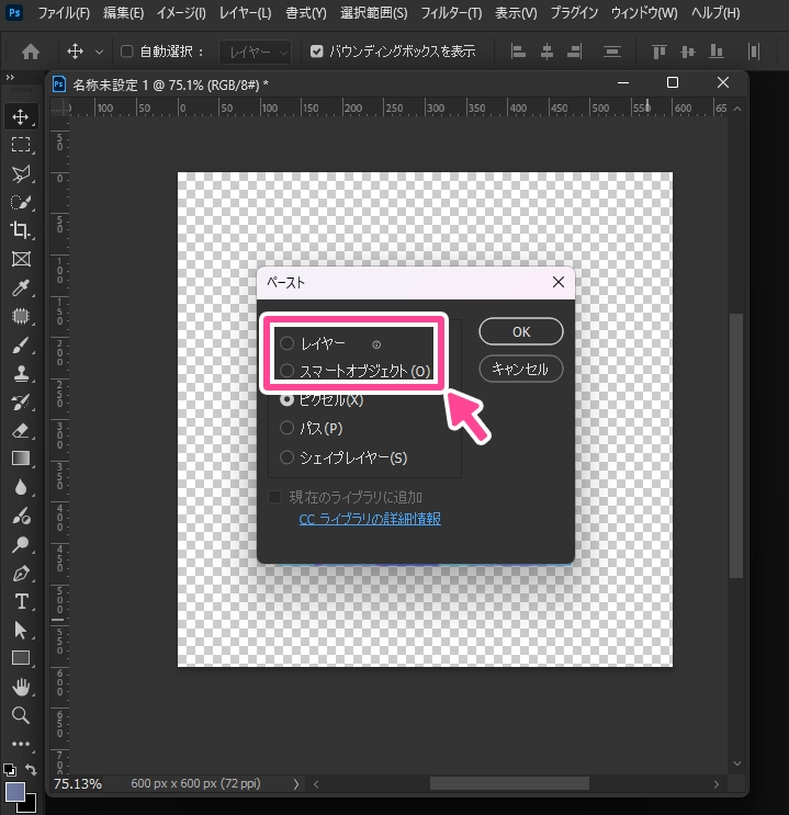 この際、ペースト形式はレイヤーまたはスマートオブジェクトでペーストしておくと、後から色の変更等が簡単にできるためおすすめです。