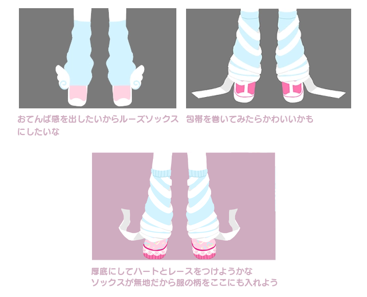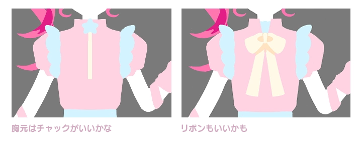 スポーティな感じやおてんばな感じを出したいな。デフォルト衣装の配色(ピンク・水色)や模様(ストライプ)をそのまま取り入れたいからフリルとかも合いそうだな。など、入れたい要素を考えながらいくつか案を出してみました。